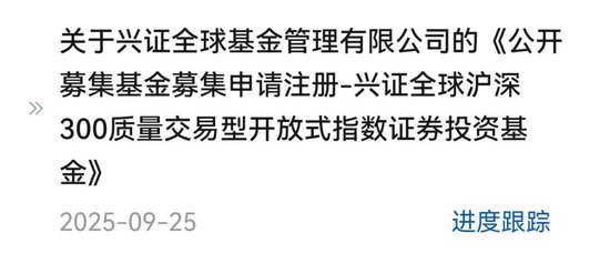 证监会网站显示,9月25日,兴证全球基金上报了兴证全球沪深300质量ETF,目前处于接收材料的状态。